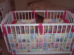 Úžasný nápad jednej maminy na hniezdo okolo celej postieľky s otvorom, aby dieťatko mohlo vyliezť.Použila som bavlnenú látku s motívom disney,kombinovanú s cyklámenovou bodkovanou na volánikoch a mašličkách. Vo vnútri je dvojitý vatelín gramáže 250 g/m2, takže hniezdo je pevné,ale zároveň mäkké. Na objednávku vyrobím z ktorejkoľvek látky z mojej ponuky, termín od 1.7.