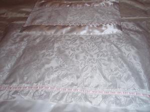 Hniezdo a obliečky do detskej postieľky z bielej saténovej látky , kombinovanej s brokátom a krajkou. Obliečky sú veľkosti 40 x 60 a 90 x 130 cm. Všetko pre malú princeznú.