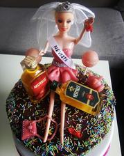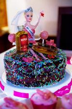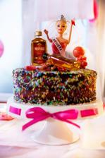 Čokoládovo malinovo smotanová torta s ganache. Šaty pre barbie, kabelka a prasiatko sú z marcipánu.