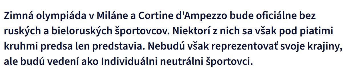 Od začátku plnohodnotné války bylo Ruskem zabito 660 ukrajinských sportovců a trenérů. Stovky našich sportovců už nikdy nebudou moci startovat na olympijských hrách ani na jiných mezinárodních soutěžích. Přesto je nyní v Itálii 13 Rusů, kteří se účastní olympiády. Na hrách soutěží pod „neutrálními“ vlajkami, zatímco v běžném životě veřejně podporují ruskou agresi proti Ukrajině a okupaci našich území. A právě oni si zaslouží diskvalifikaci.
