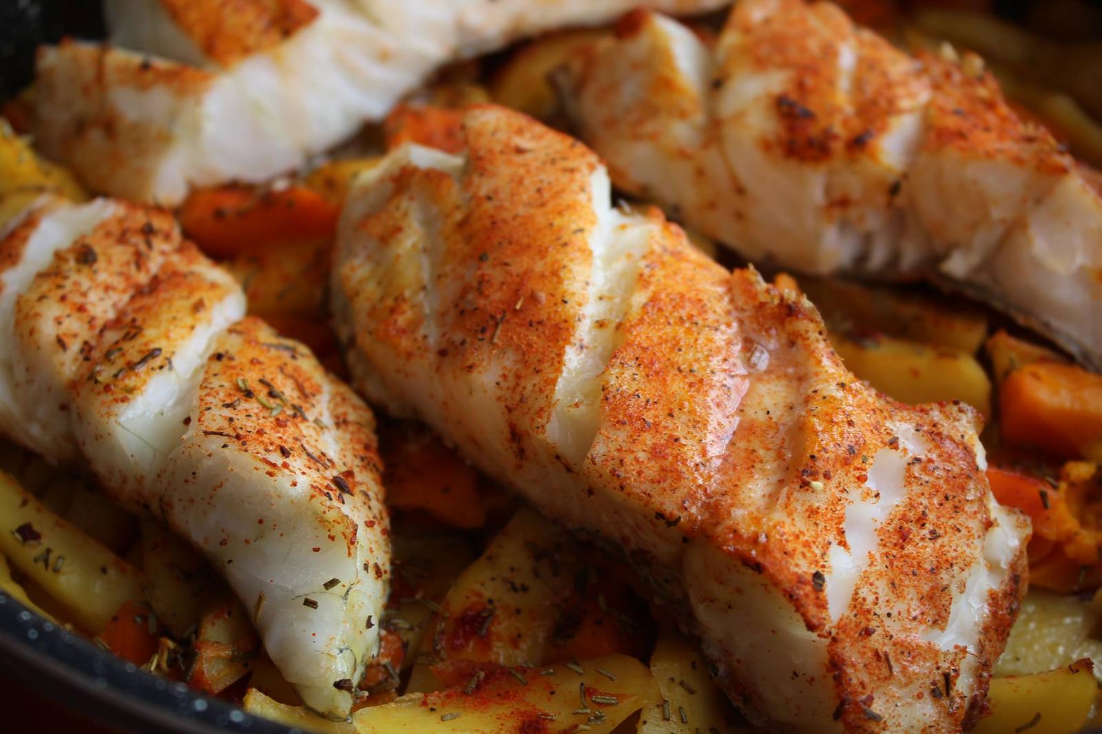 Pečený zubáč s tekvicou a zemiakmi na rozmaríne