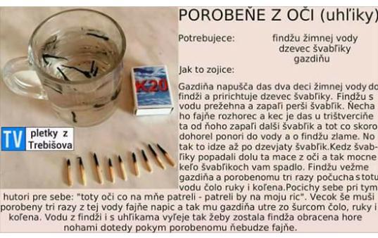 Prichystaj si pohár s vodou. Zapalis zapalku a povieš "od ženy" a hodis do pohára ..potom ďalšiu a povies "od muža" a ďalšiu"od dieťaťa" a tiež hodis. Ta,ktora ti spadla,napr od zeny,znamena že žena ti porobila. Potom z toho pohára kvapku odpijes,nie veľa len trosilinku