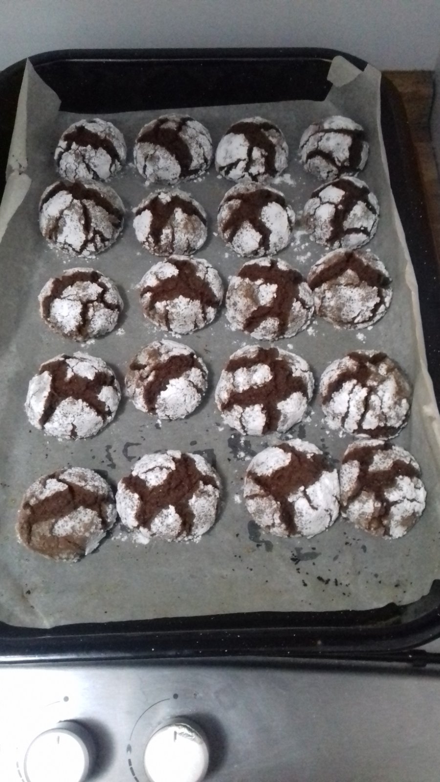 Čokoládu si roztopíme vo vodnom kúpeli a necháme jemne vychladnúť. V miske zmiešame múku a kypriaci prášok. Do ďalšej misky dáme maslo, cukor, vanilk. extrakt a rozpustenú čokoládu a spolu vymiešame mixérom. Pridáme po jednom vajíčka a vmiešame. Nakoniec primiešame aj múčnu zmes a vytvarujeme cesto. Uložíme do chladničky aspoň na 3 hodiny alebo najlepšie cez noc (ja som nechala 6 hodín). Rúru si predhrejeme na 180°C. Dva-tri plechy si vystelieme papierom na pečenie. Pripravíme si dve misky alebo taniere – do jednej dáme kryštálový cukor, do druhej práškový cukor. Z cesta formujeme malé guľôčky, ktoré najprv vyvaľkáme v kryštálovom cukre a potom poriadne v práškovom cukre. Uložíme na plech a dáme piecť na 8-10 minút. Necháme vychladnúť na plechu a potom si už na nich len pochutnávame 🙂