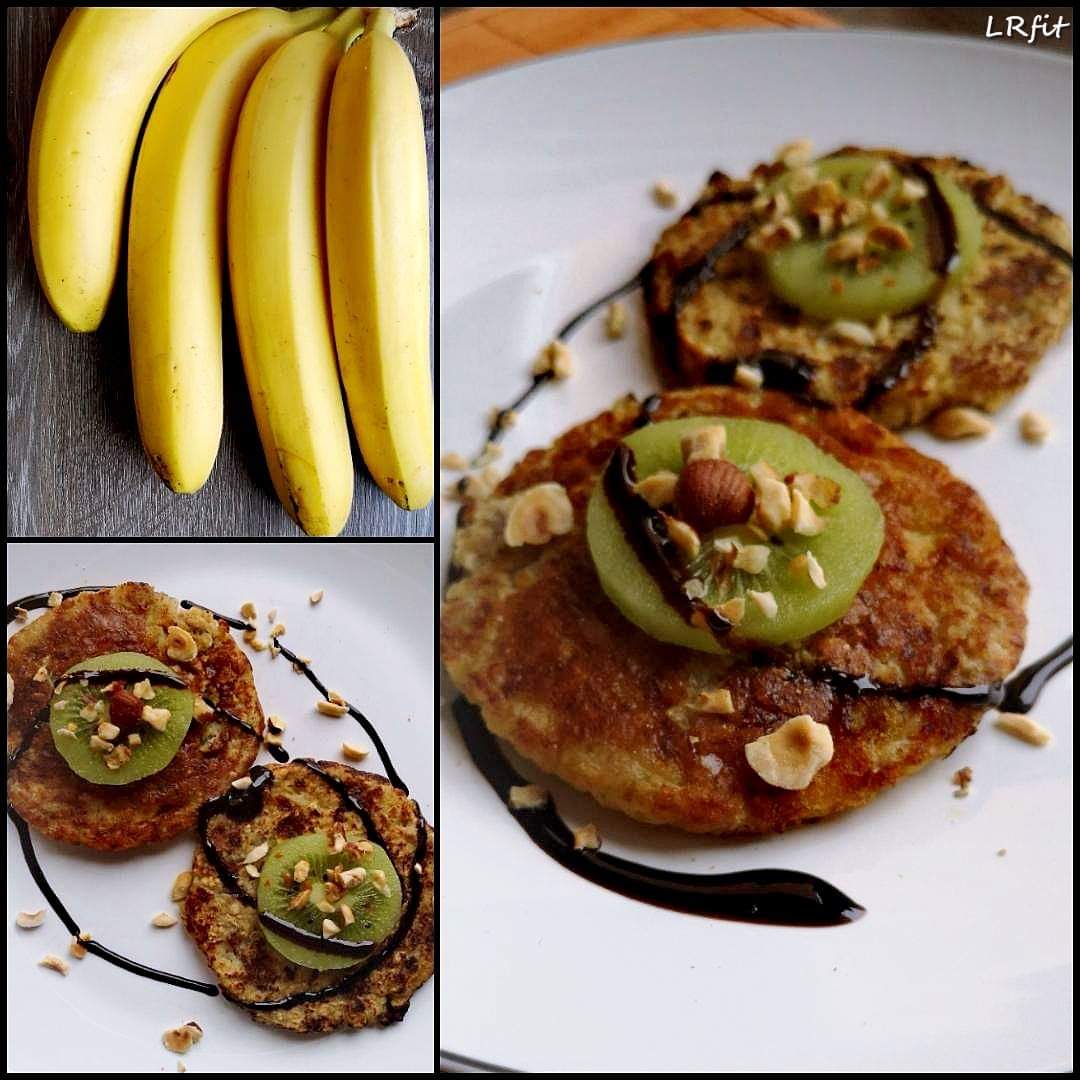 Potrebujeme (5 ks):-2 banány-1 vajíčko-pol šálky jemných ovsených vločiek-olej na pečenie-kiwi-tmavú čokoládu (85%)-sekané lieskové oriešky
