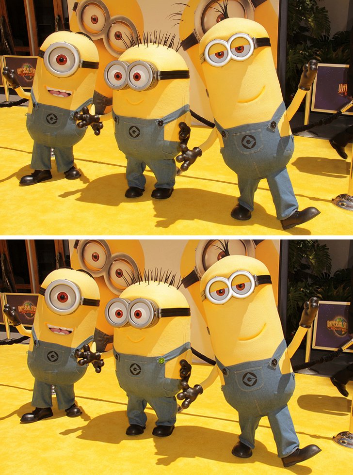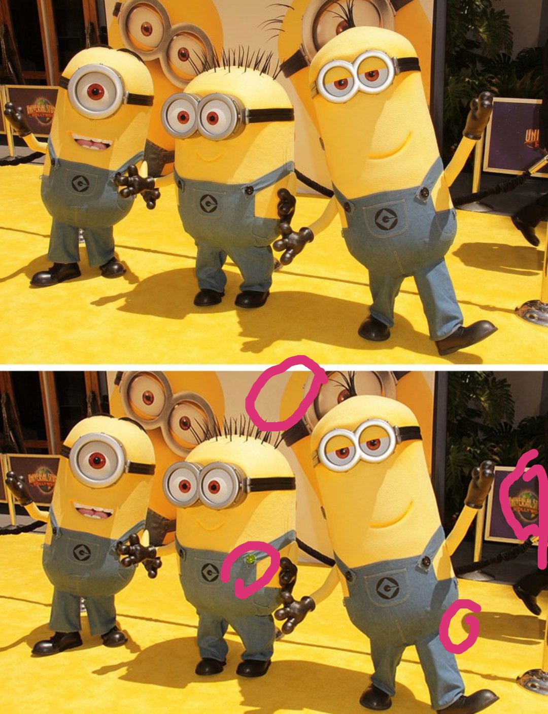 Tieň vzadu za mimoňmi, zelený gombík na gatiach. vlasy na zadnom plagáte, logo na pravej tabuli