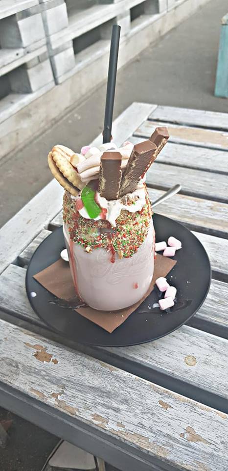 Jahodový milkshake s keksíkmi,gumovými mackami a plnený šľahačkou.