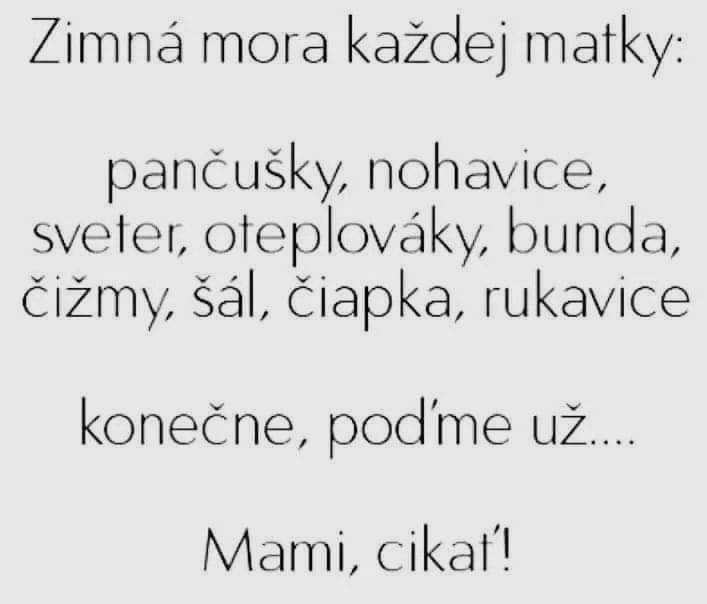 Ja obliekam dcéru už do overal a vedľa mňa cupi jej brat a kaka. Tak vezmem jeho, prebalim, obliekam do overaly a dcéra si cupne ku nám a kaka. Tak znova dole jej overal, pribaliť....