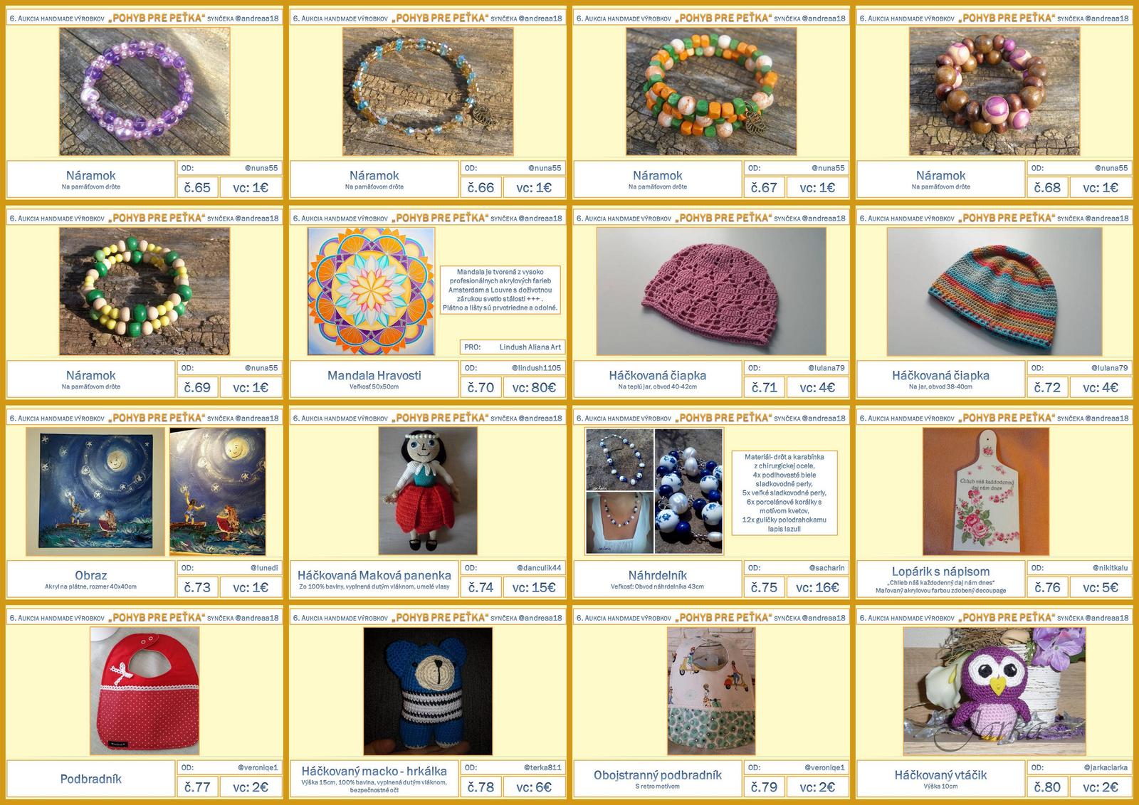Do Výzvy na darovanie handmade výrobkov sa zapojilo 166 darcov (o 22 viac ako bolo zapojených do 5.aukcie). Boli to títo darcovia: