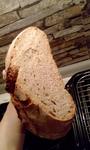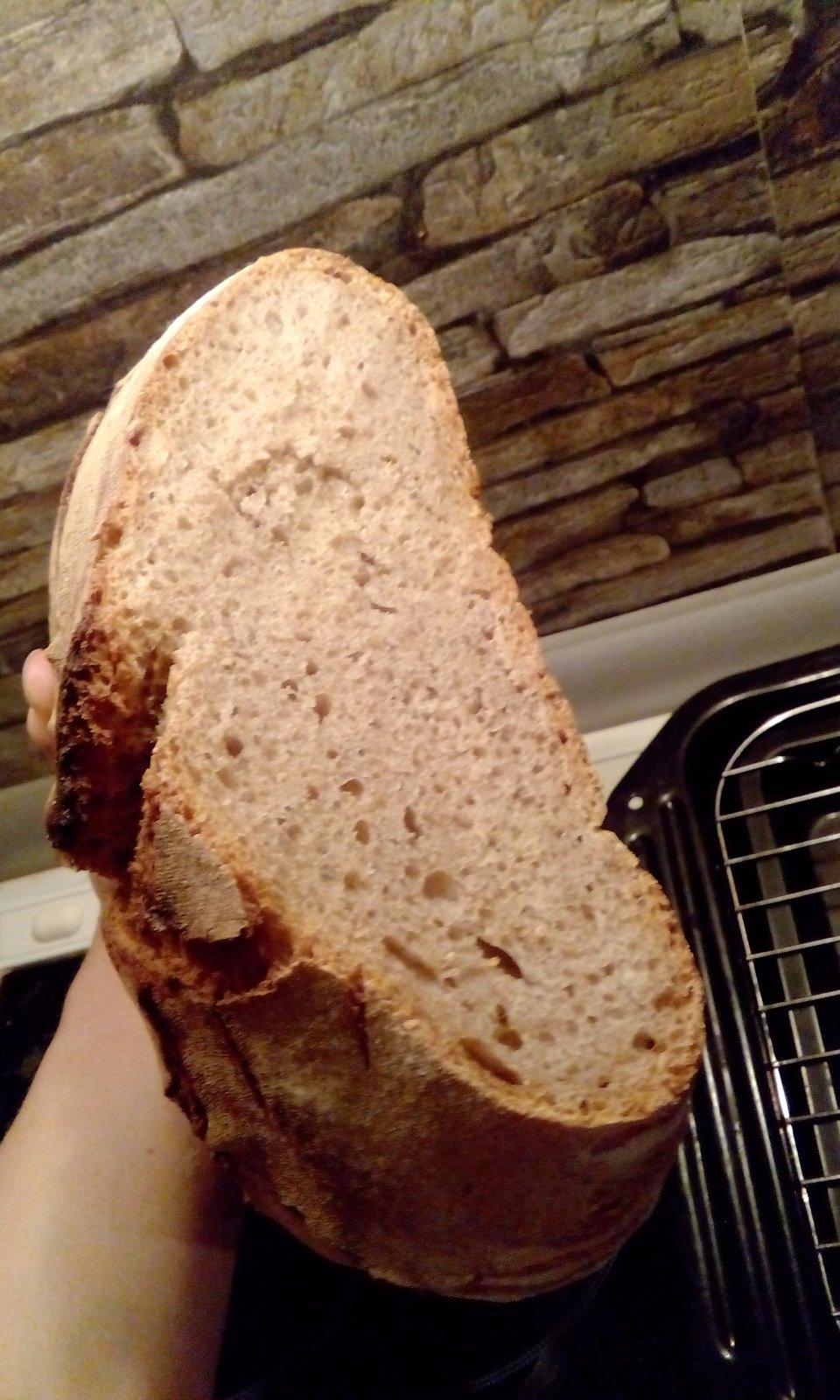 Tento chlebik moj je taky dosť hutny,lebo sa mi hrozne lepilo to cesto,tak som musela vela podsypavať mukou pri spracovani...ale nabuduce budem vypylovávať