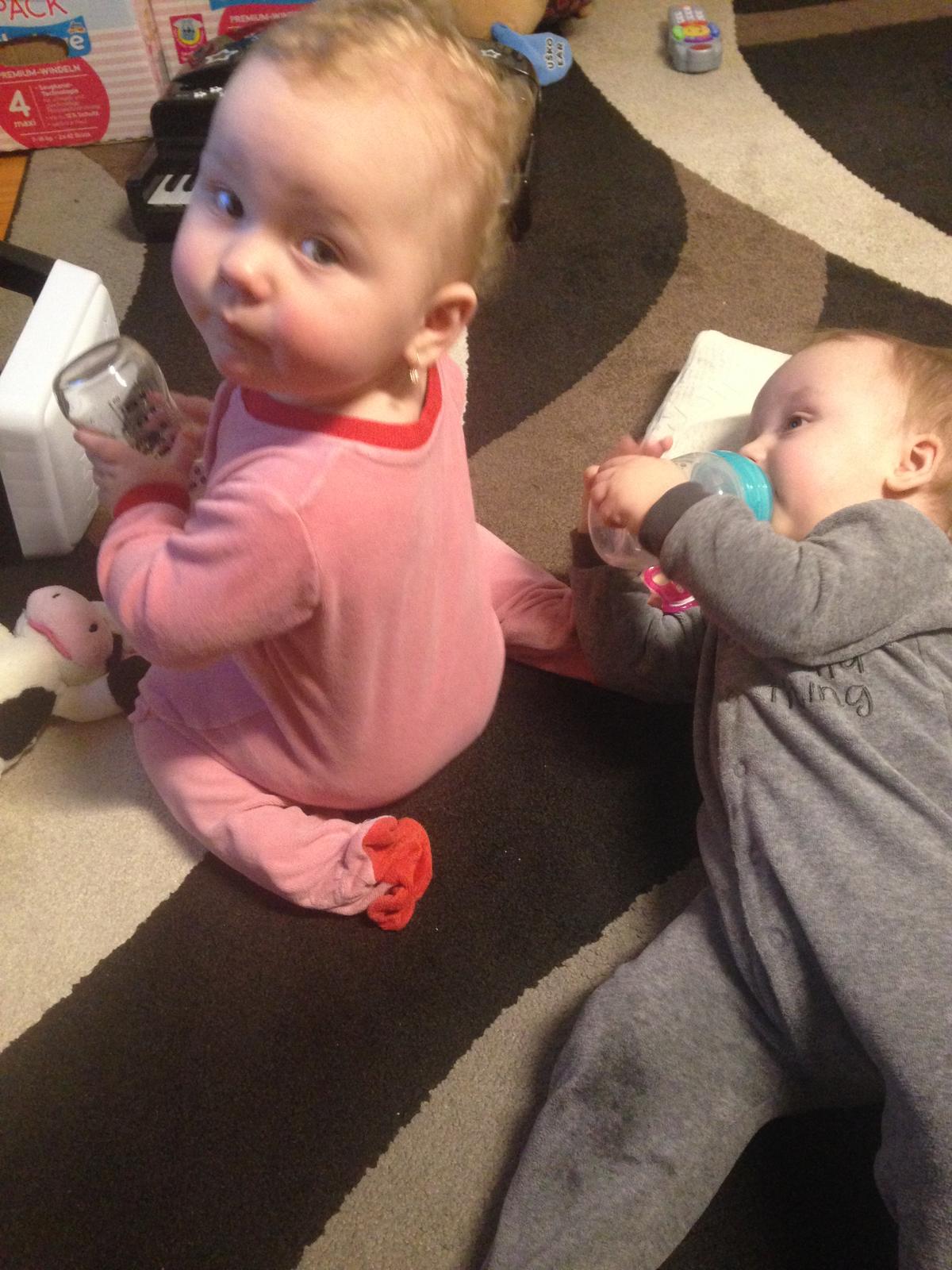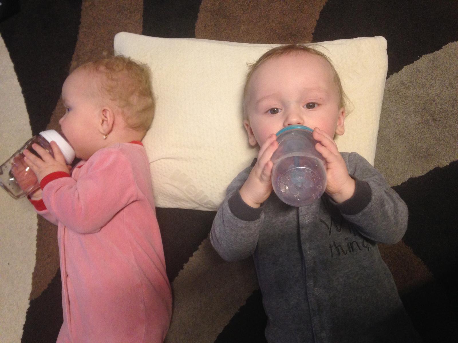 Sklenená fľaška je už v inej hmotnostnej kategórii. No aj napriek tomu som ju dala deťom na vyskúšanie a privlastnila si ju Miška. Fľaška zo skla vo mne vyvoláva obavy, pretože 11-mesačné dieťa sa už nenechá krmiť samé, no a keď sa napije, bum flašku na zem. Z tohoto dôvodu som ju deťom dávala len vtedy, keď ležali na koberci, lebo pád z jedálenskej stoličky by určite neprežila. Obe fľašky mali cumlíky s minimálnym prietokom, ale nezväčšovala som ho nastrihávaním, nechcela som zasiahnuť do cumlíka a poškodiť ho. Deti aj z tohoto cumlíka dokázali piť čaj. Síce to trvalo dlho, no napili sa. Problém nastával v tom, že ich silné sanie vťahovalo cumlík dnu.