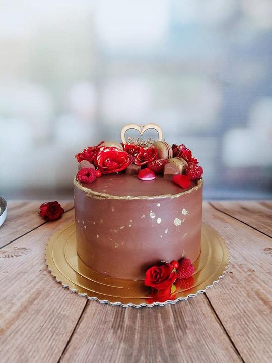 Čokoládovo - vanilková s drip polevou 🍫🍰bielou čokoládou a kopou jahôd vo vnútri do zdobená zlatom a jemným zdobením 🍰🌺