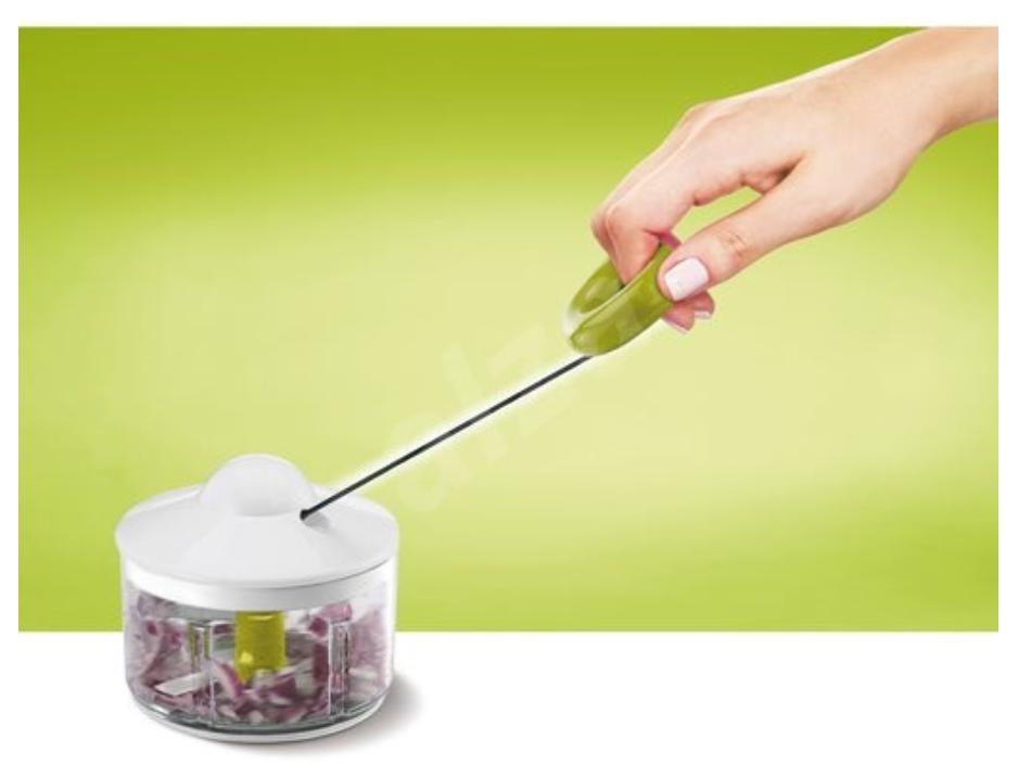 Pri sekaní poťahujeťe za madlo, ktoré je vo vrchnáku. Je upevnené na šnúrke, pomocou ktorej sa roztočia nože sekáčika. Stačí 3-5 potiahnutí na nasekanie cibule. Počtom potiahnutí regulujete výslednú jemnosť nasekania.