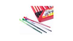 Tenké trojhranné farbičky, odporúčam ich všetkými desiatimi pre deti, ktoré milujú používať v obrázkoch veľa farieb, ale majú málo miesta v peračníku. Farbičky totiž možno zastrúhať z oboch strán a na každej strane je iná farba. Dodávajú sa ako 12/18/24 kusové, získate tak pre vaše dieťa až 24/36/48 farieb!