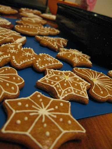Zdobíme polevou z bielka, preosiateho cukru a kvapky citrónovej šťavy. Alebo ešte pred pečením dáme na medovníček olúpanú mandlu alebo vlašský orech.