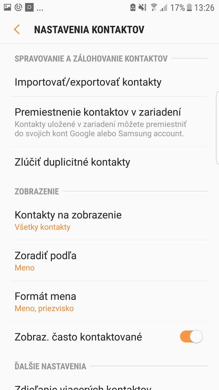 Mam.s6 edge a ja ked si otvorim kontakty tak uplne hore mam.riadok ze hladat na na konci toho.riadku je trojbodka na to ked si kliknem mam tam moznost nastavenie a v nej toto
