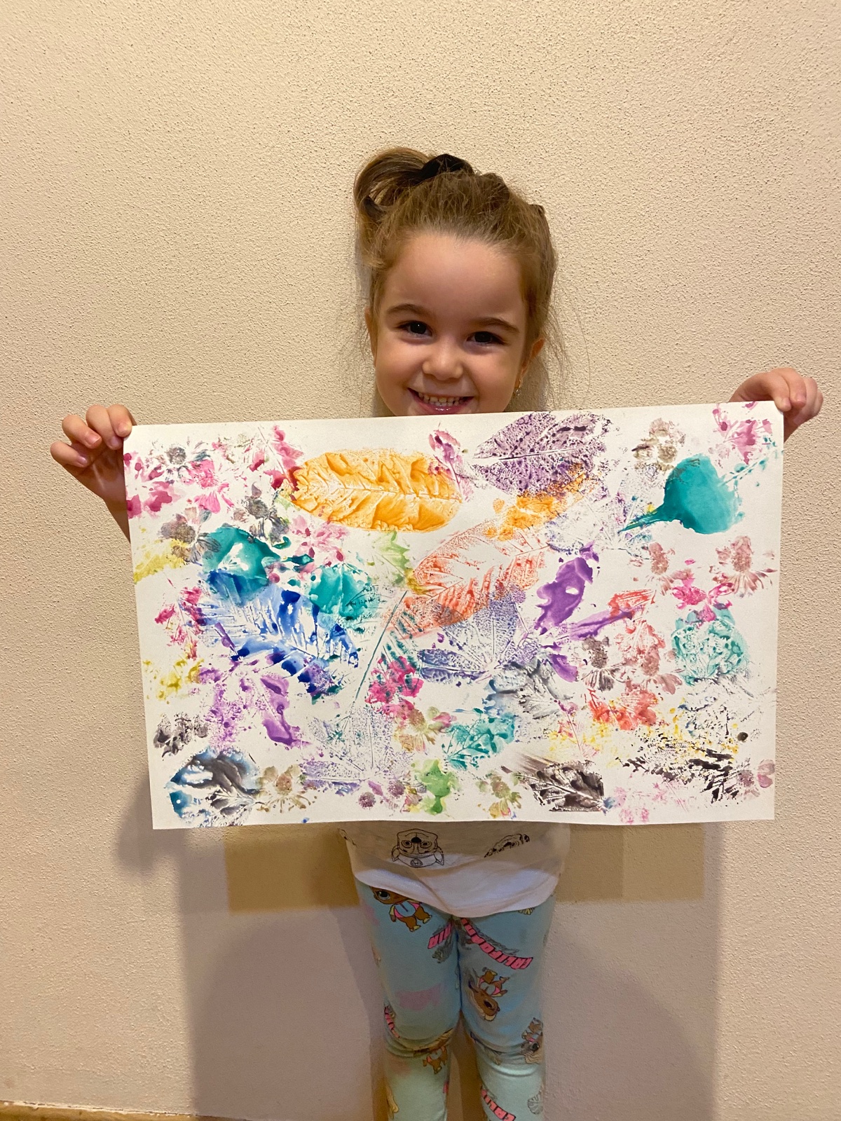 ➡️ Samantu som nechala vyblázniť s farbami a podľa svojho gusta pomaľovala väčší papier. Použili sme prstové farby, štetce a hlavne ruky.