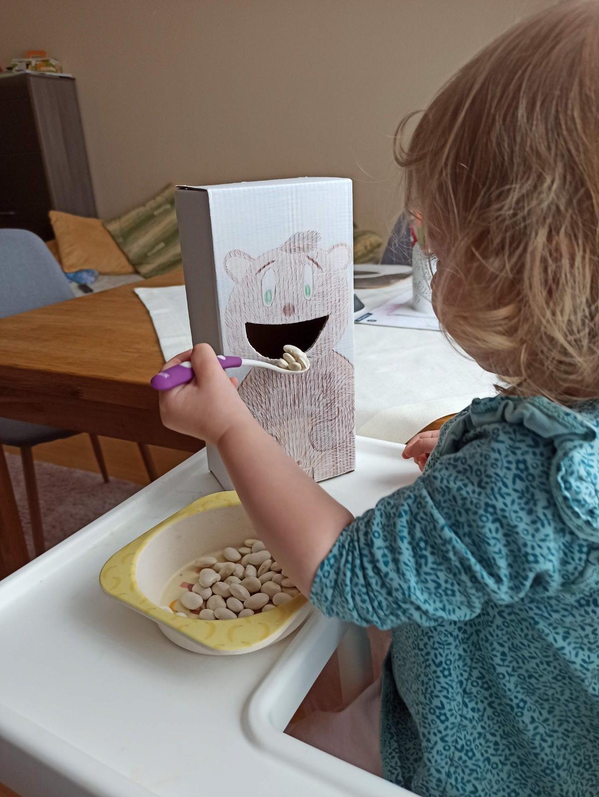 Okrem trénovania práce s lyžičkou sú k nemu zdarma ďalšie aktivity - rozsýpanie fazule, zbieranie fazule, presýpanie fazule, zametanie fazule, vysávanie fazule a nútenie mamy aby kŕmila macka. 😁 Odporúčam!