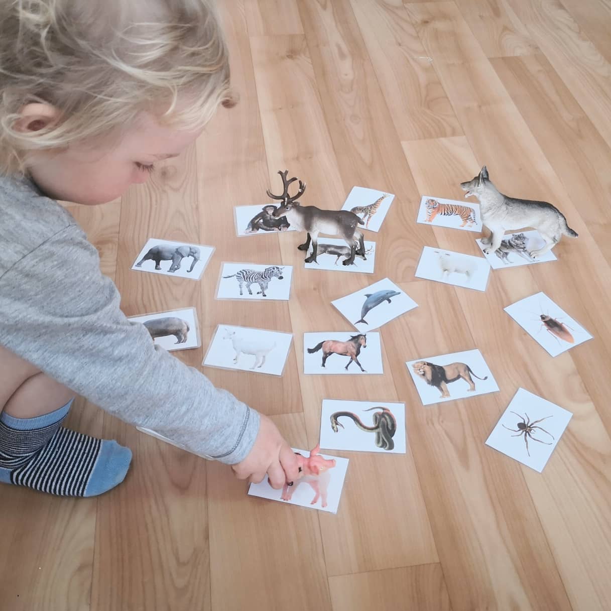 Vytlačila som reálne obrázky zvierat, ktorých figúrky máme doma, a zalaminovala. 🙂 Mladý pánko k nim priraďuje figúrky.