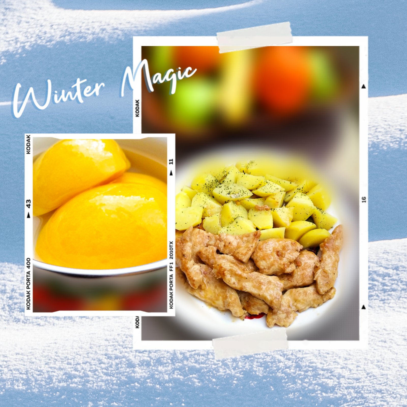 Kuracie prsia z marinady,zemiaky,broskynovy kompot
