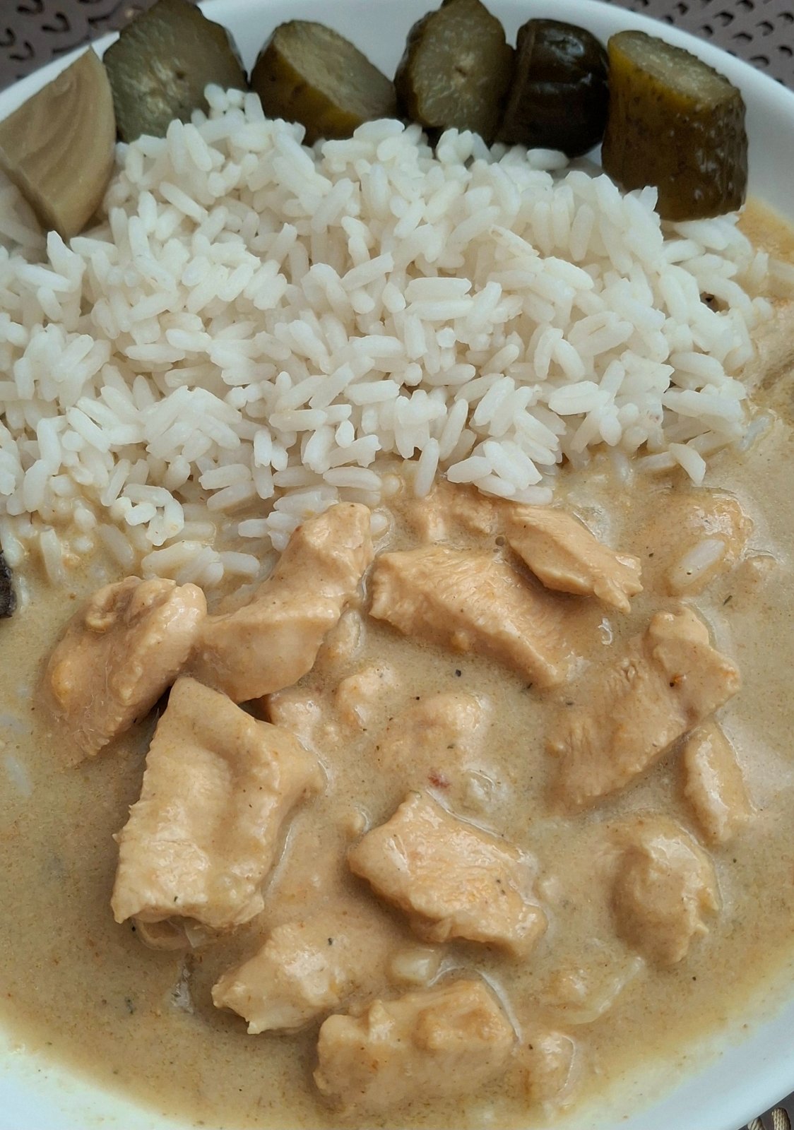 Marinovane,pikantne kuracie prsia s kokosovym mliekom,ryza Parboiled,uhorky