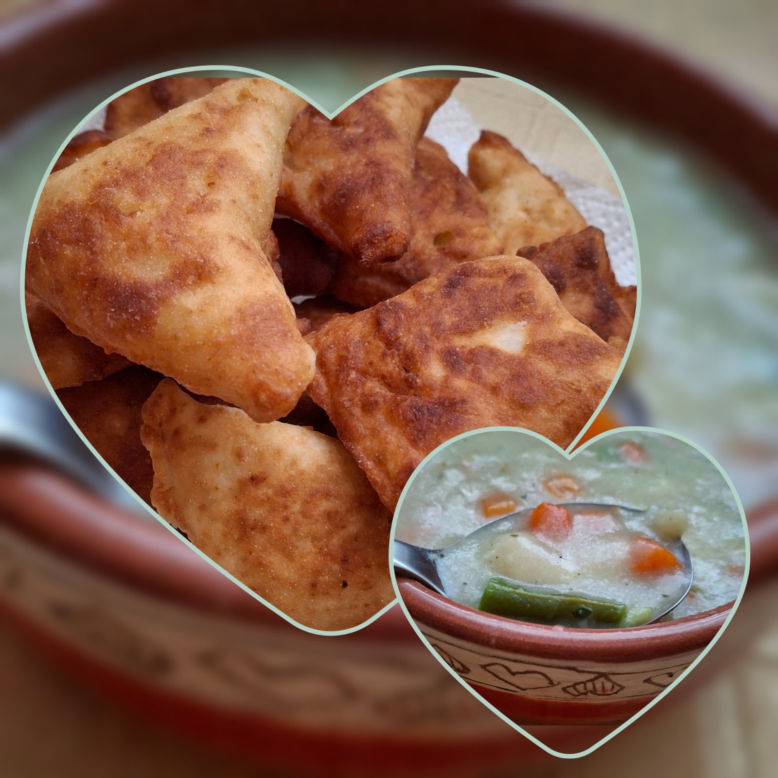 Polievka husta,zeleninova s haluskami.Vysmazane pirozky a tasticky plnene zemiakmi z jogurtoveho cesta