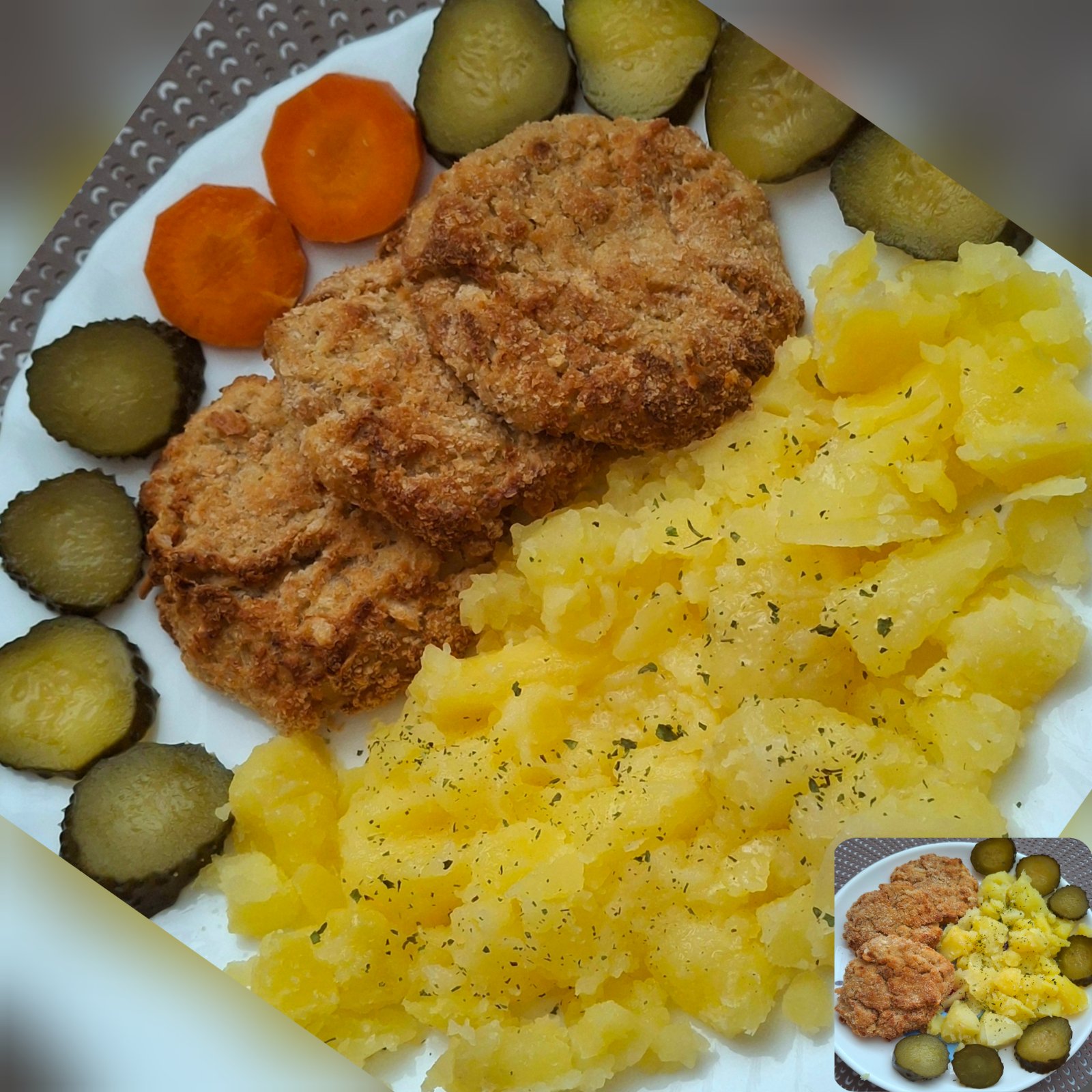 Uvareny a popuceny karfiol,3 vajcia,struhanka 5 PL,ovsene vlocky 1/2 salky,zaliate vriacou vodou a vyzmykane,vegeta,2 PL oleja,3 struciky cesnaku,mlete korenie,2 PL muky spaldovej.