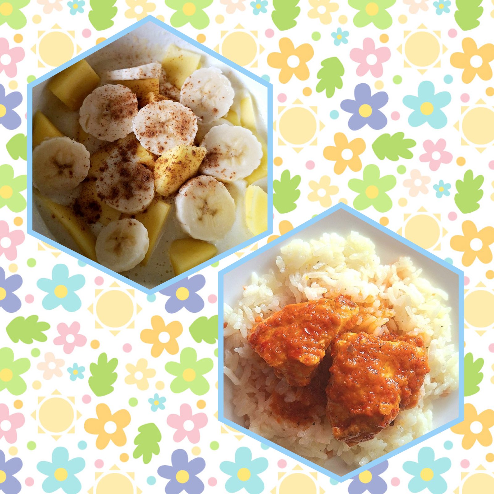 Ranajky,psenova kasa s bananom,mangom,kakaom. Ryza,morcacie prsia s ajvarom