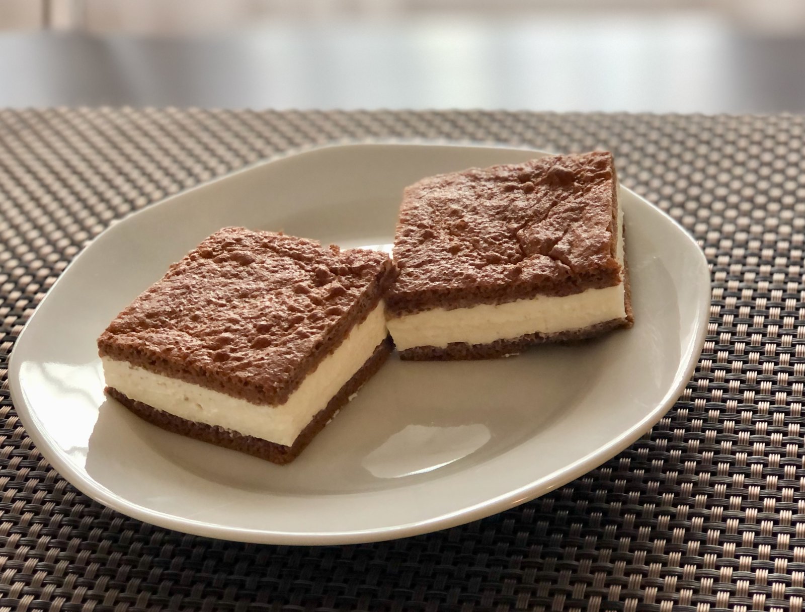 4 žĺtka vyšľahať s 3 PL kakaa, 2 PL medu. 4 bielka na sneh a primiešať k ost. ingred. Piecť na menšom plechu 200 st. /12 min. Plnka 500g jemného tvarohu s 1 PL alebo KL medu ( môžete dať trochu citrón. kôry). Môžete želatínu, nemusíte. Vychladnuté cesto na polovicu, natrieť plnku a druhu časť cesta navrch.
