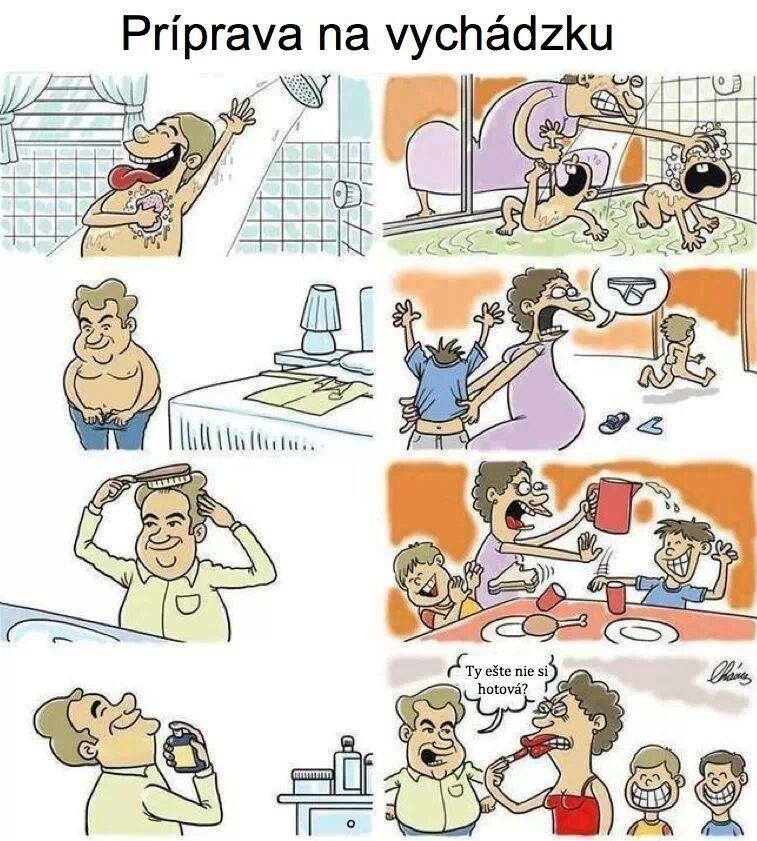 vacsinou ja som este v spodnom pradle deti oblecene, nachystane veci ,ved jest treba aj vonku, vodu, a dotycny stepuje uz pri aute alebo pri brane ,ze co robim.... nezabi ho ... niekedy mam sto chuti hodit po nom panvicu..🙂 .ale par krat som to urobila opacne , ale nepoucil sa... zuril, krical, a ja klud. obliekala som len seba 🙂