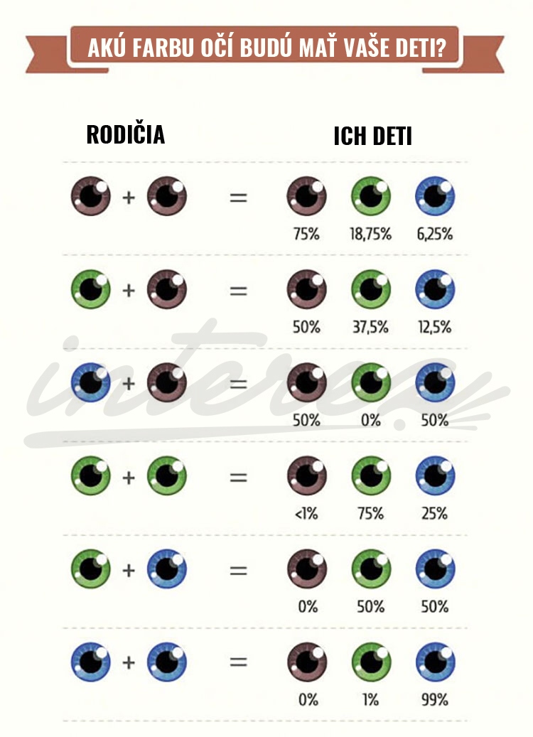 Skoro každý pár sníva o tom, že raz bude mať deti. Predstavujú si dievčatá, chlapcov a niekedy možno aj dvojičky. To, ako budú vyzerať, však nedokáže odhadnúť nikto. Vďaka tejto infografike však môžete aspoň približne zistiť, ako budú vaše deti vyzerať. Ako je to možné? Je to jednoduchá genetika.