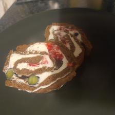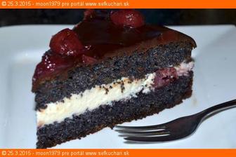 Po vychladnutí si cesto rozrežeme na polovičku, natrieme ho džemom, rovnomerne rozložíme vykôstkované višne a natrieme krémom. Zakryjeme druhou polovičkou cesta a rovnomerne oblejeme čokoládovou polevou. Na vrch môžeme navrstviť višne (ja som si upálila trošku karamelu, pridala som višne, podliala 2PL šťavy z višní, chvíľu povarila aby sa karamel rozpustil a jemne som navrstvila na čoko polevu)