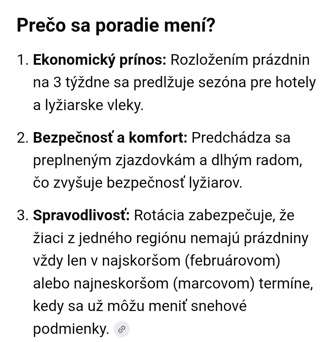 Strieda sa to preto, aby to bolo spravodlivé. Raz si deti užijú "studenšie" prázdniny a raz jarnejšie. Vždy sa to striedalo. Takisto pre rodičov, ako píšeš, tebe to budúci rok nevyhovuje. Tento rok možno nevyhovuje termín na prelome mesiacov rodičom v inom kraji.