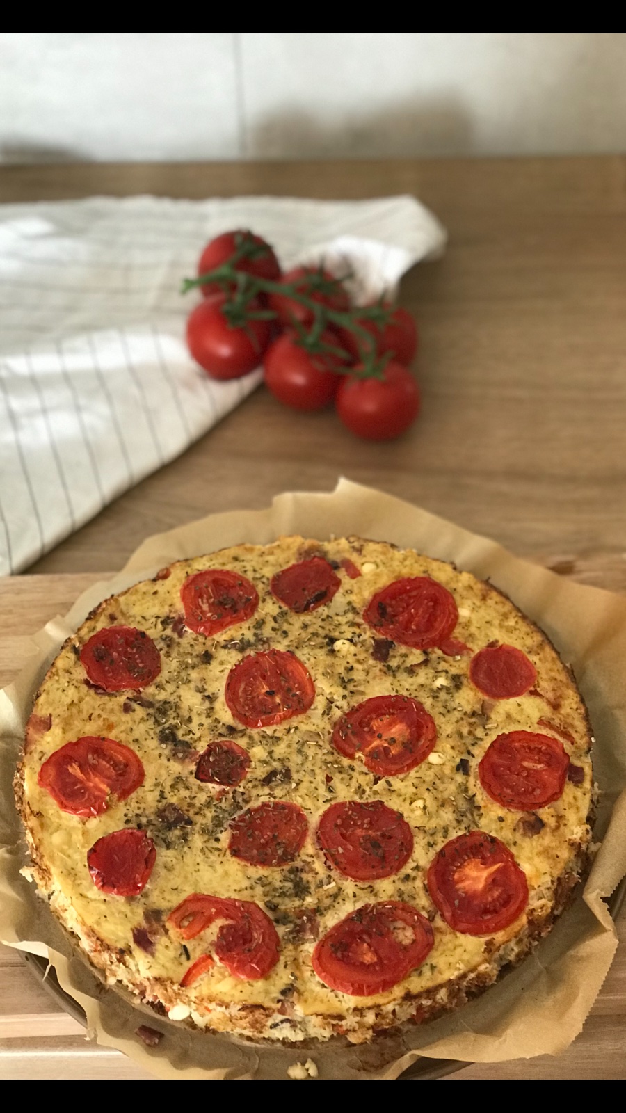 Tentokrát uvarený popučený karfiol, cesnak, soľ, korenie, 1/2 cottage, 3 vajcia, zvyšok červenej papriky, zvyšok tvrdého syra, zvyšok kyslej smotany, hrsť ovsených vločiek, mäkké paradajky a oregano.