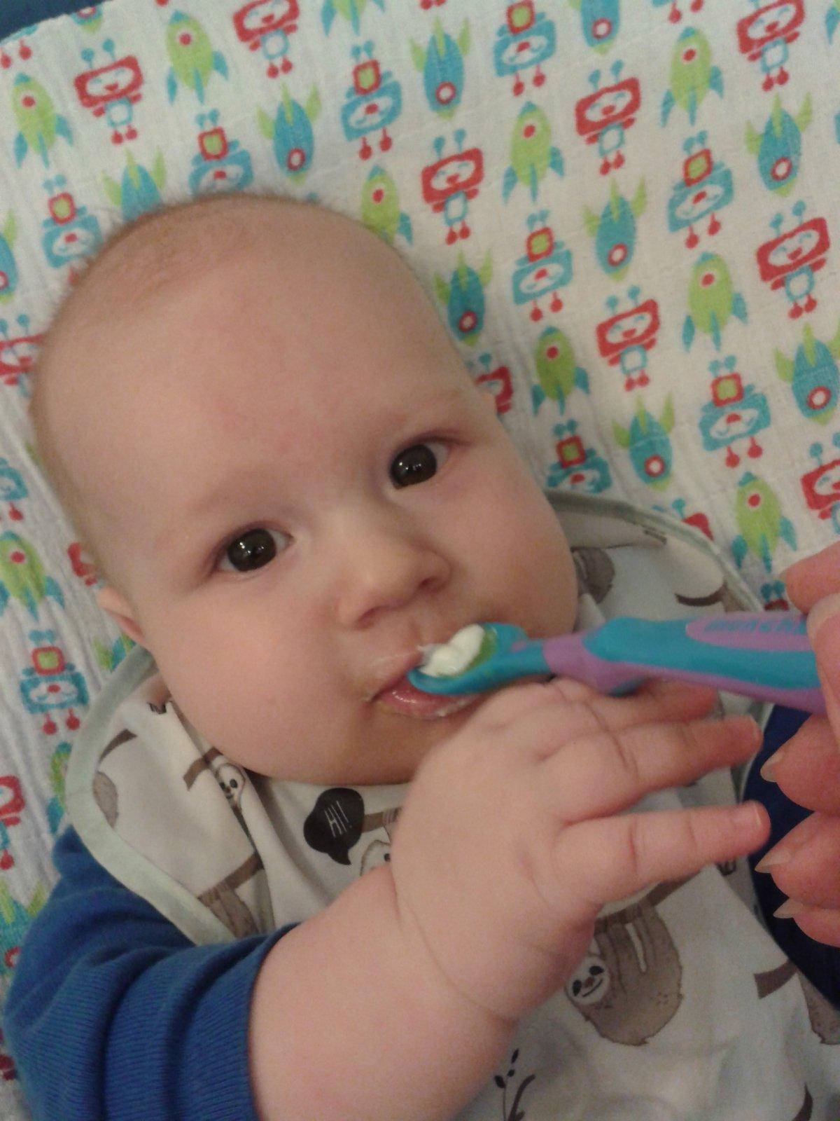 @bianca512 byla to první ochutnávka, takže snedl jenom to co je videt na lžičce a byloto myslím po obede a byl to bánovecký bílý, ten mám nejradeji, je pekne krémový a hodne smetanový, ale fajn je i hollandia nebo zvolenský a ted dávám na strídačku i kozí a ovčí jogurty