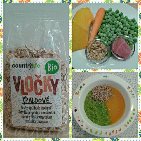7+ pokračujeme v zavádení lepku - dýnovo-mrkvová omáčka se špaldou, hráškové pyré a telecí maso + slun. olej (obed) - 1. špalda