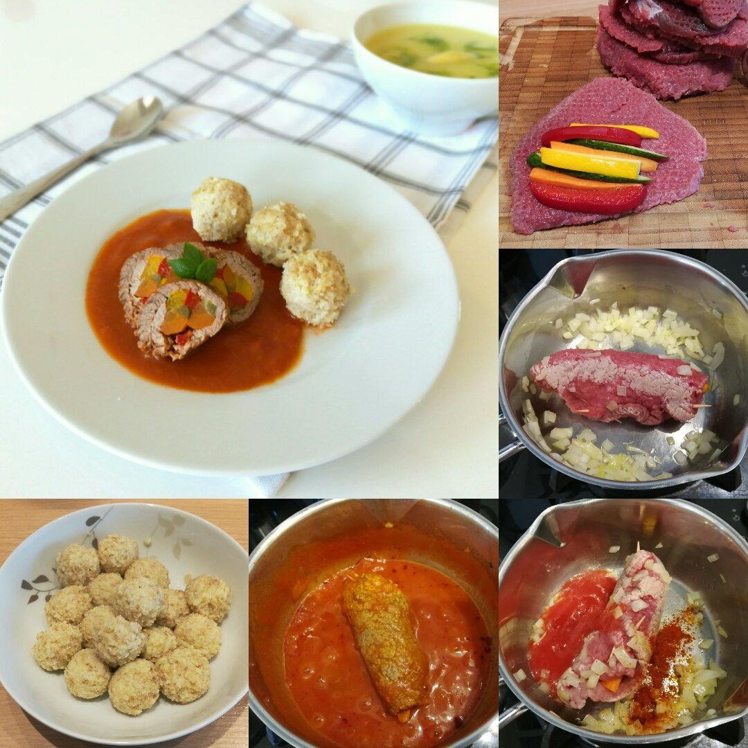 1r.+ Hovězí roláda s rajčatovou omáčkou a jáhovo-ovesné knedlíčky