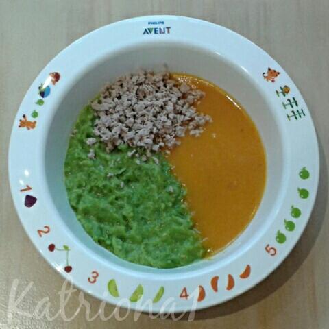 do Aventu jsem nejdrív dala naparit na 15 minut telecí maso, potom jsem na dalších 15 minut pridala pres noc namočené špaldové vločky, hrášek, dýni a mrkev, po uvarení jsem maso nakrájela nadrobno, hrášek jsem s trochou vývaru rozmixovala nahrubo a dýni, mrkev, vločky a lžičku oleje jsem rozmixovala dohladka
