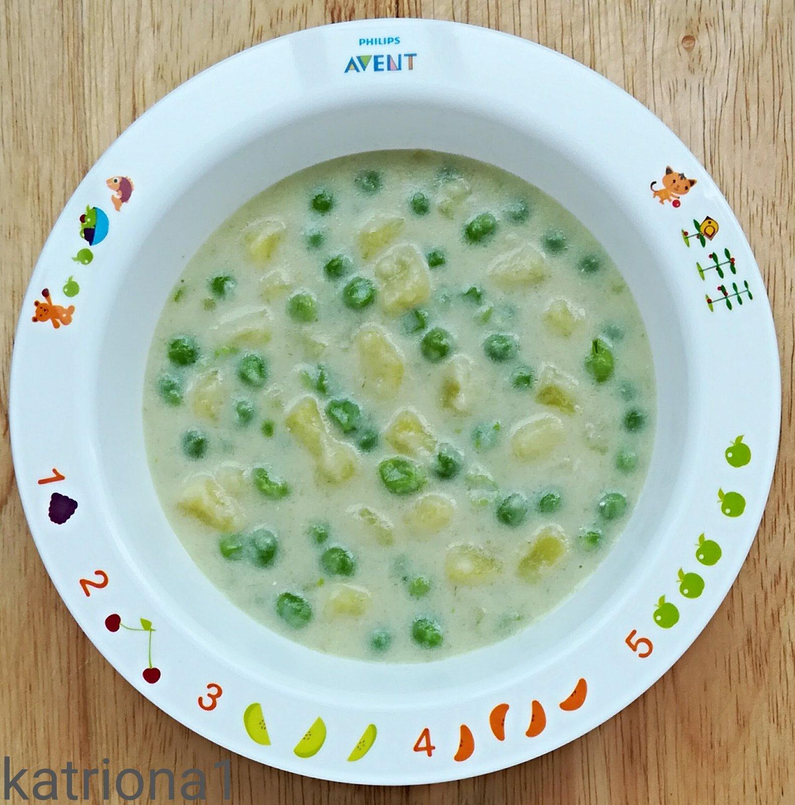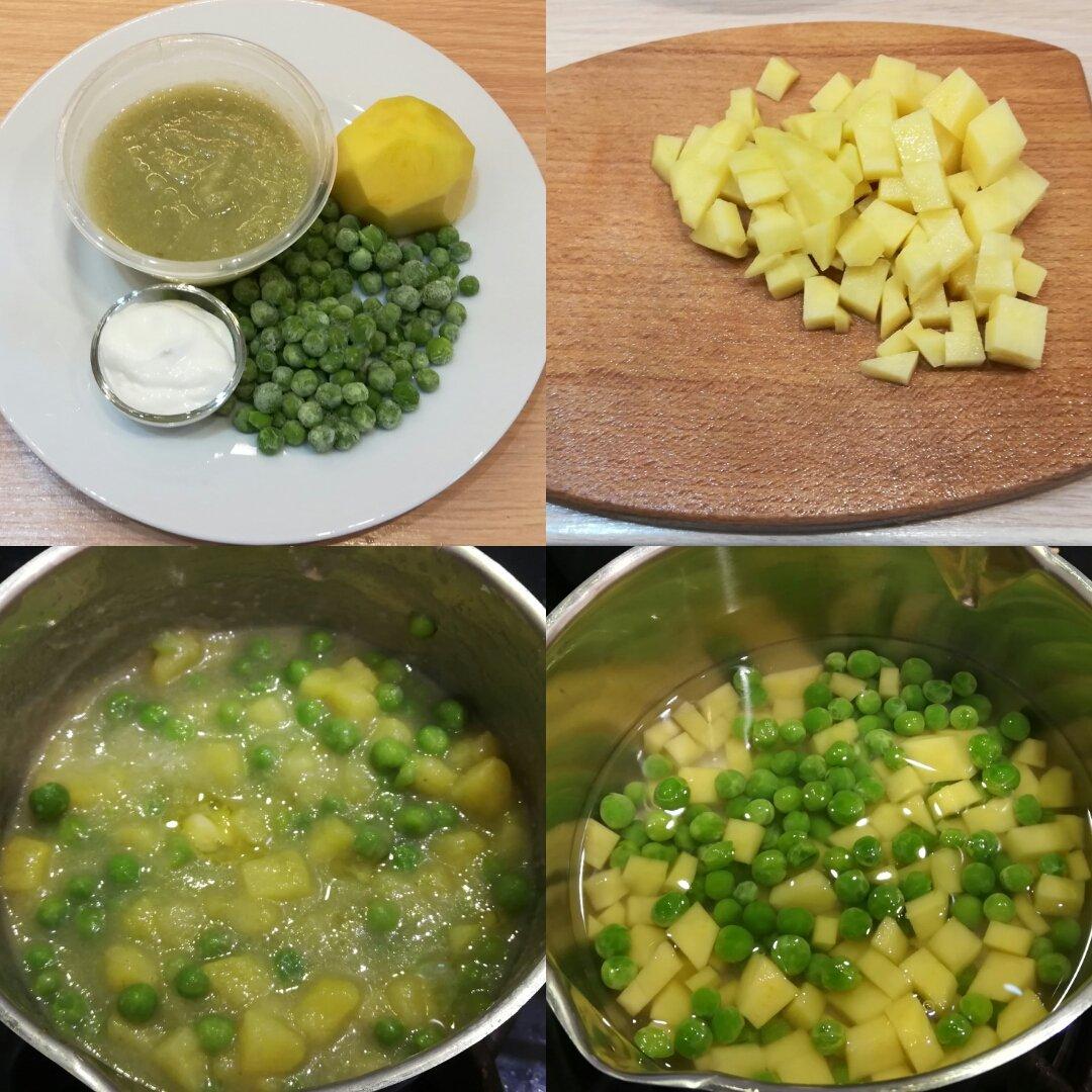 do vody jsem dala vařit hrášek a na kostičky nakrájenou bramboru, když bylo vše měkké přIdala jsem na zahuštění zeleninové pyré ( napařená a do hladka rozmixovaná zelenina ) polévku jsem ještě chvilku nechala prohřát a nakonec jsem přimíchala lžičku jogurtu ( jiný olej jsem už nedávala )