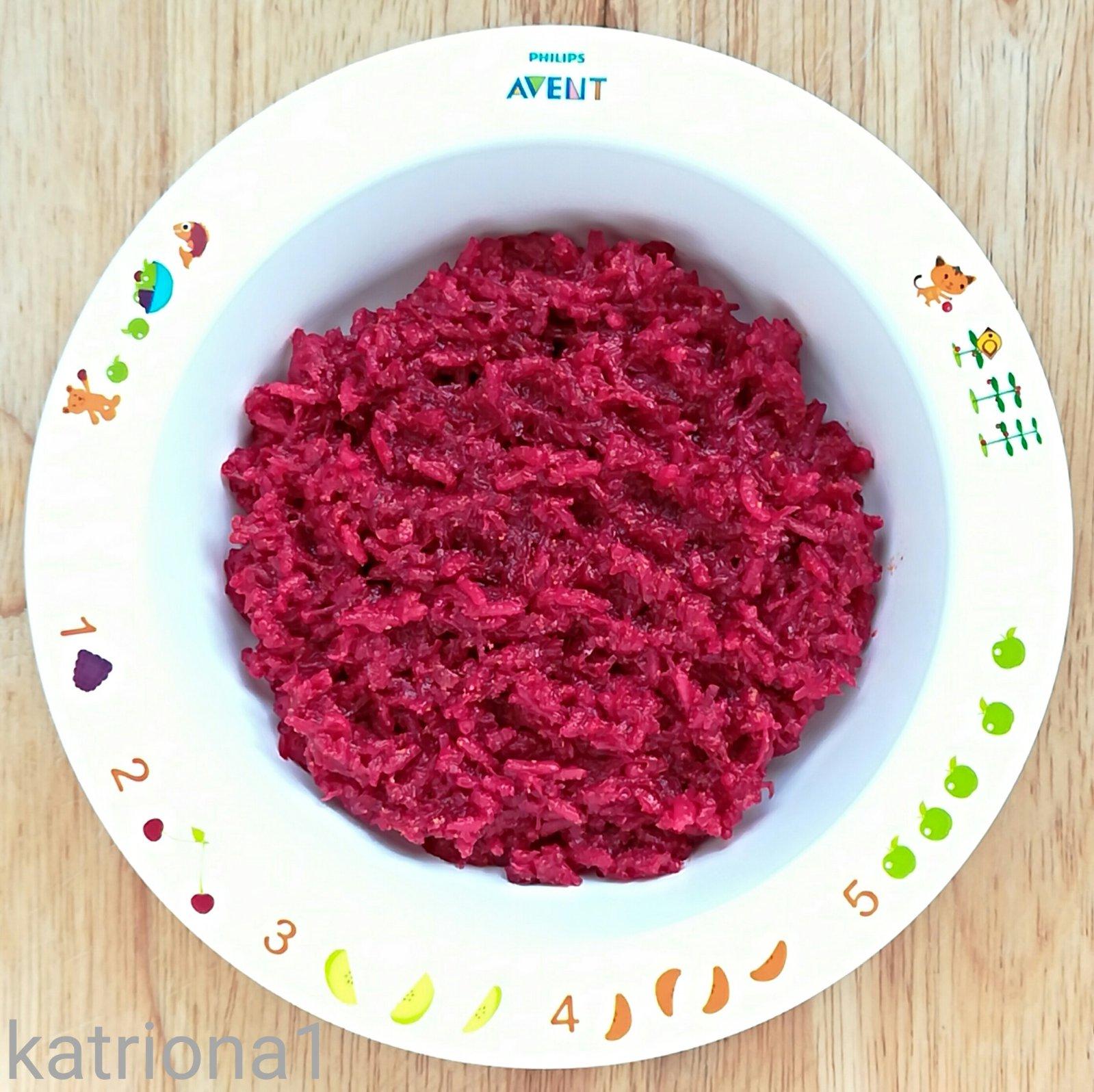 mrkev a petržel jsem si nastrouhala a spolu s porkem jsem vše dala vařit do vody, když byla zelenina poloměkká, tak jsem přidala propláchnutou rýži a nechala jsem rizoto uvařit doměkka, nakonec jsem přidala předem uvařenou a najemno nastrouhanou cviklu a ghee