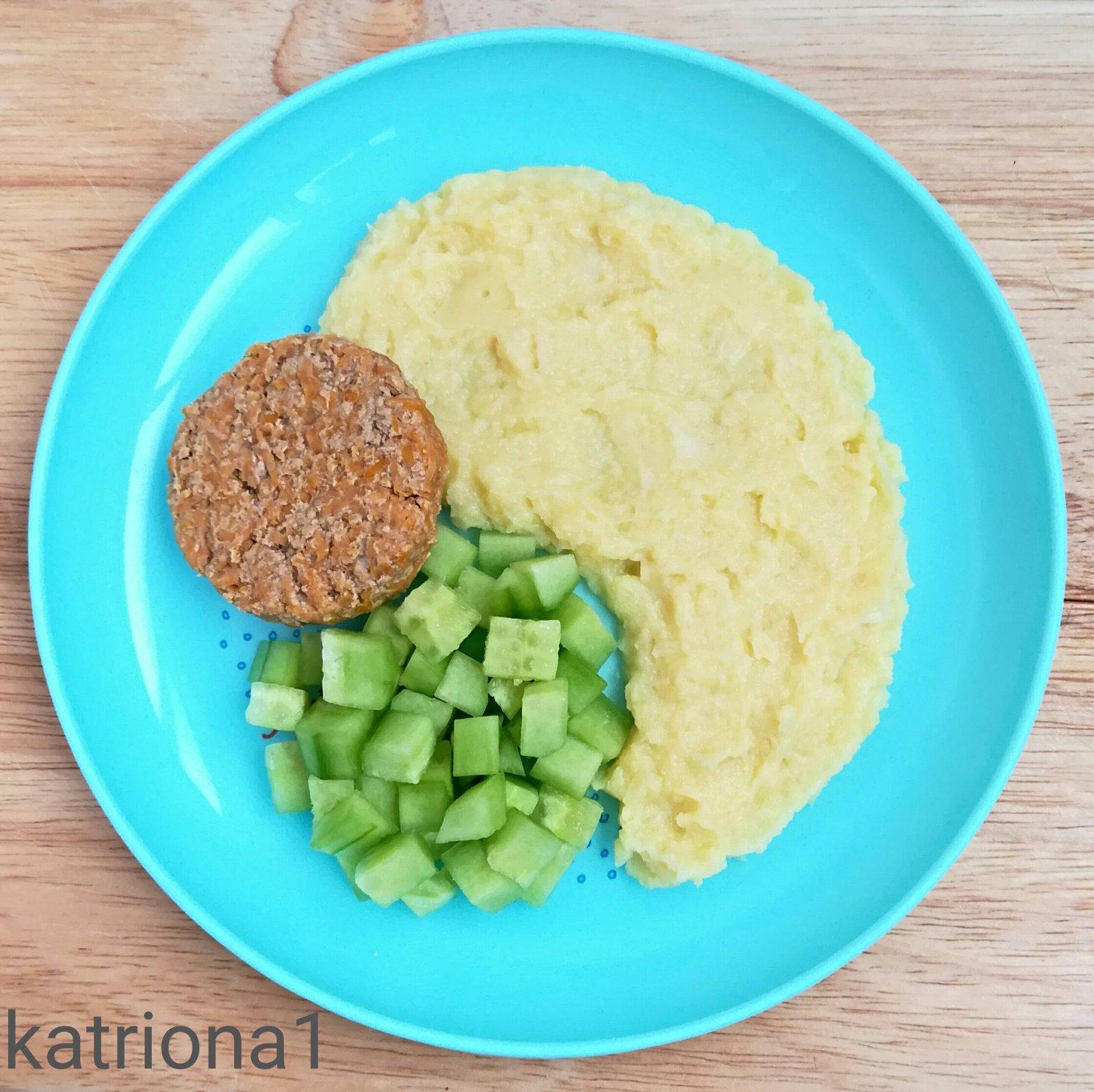 9+ hovězí karbanátek s mrkví a bramborovo-pastináková kaše, okurka