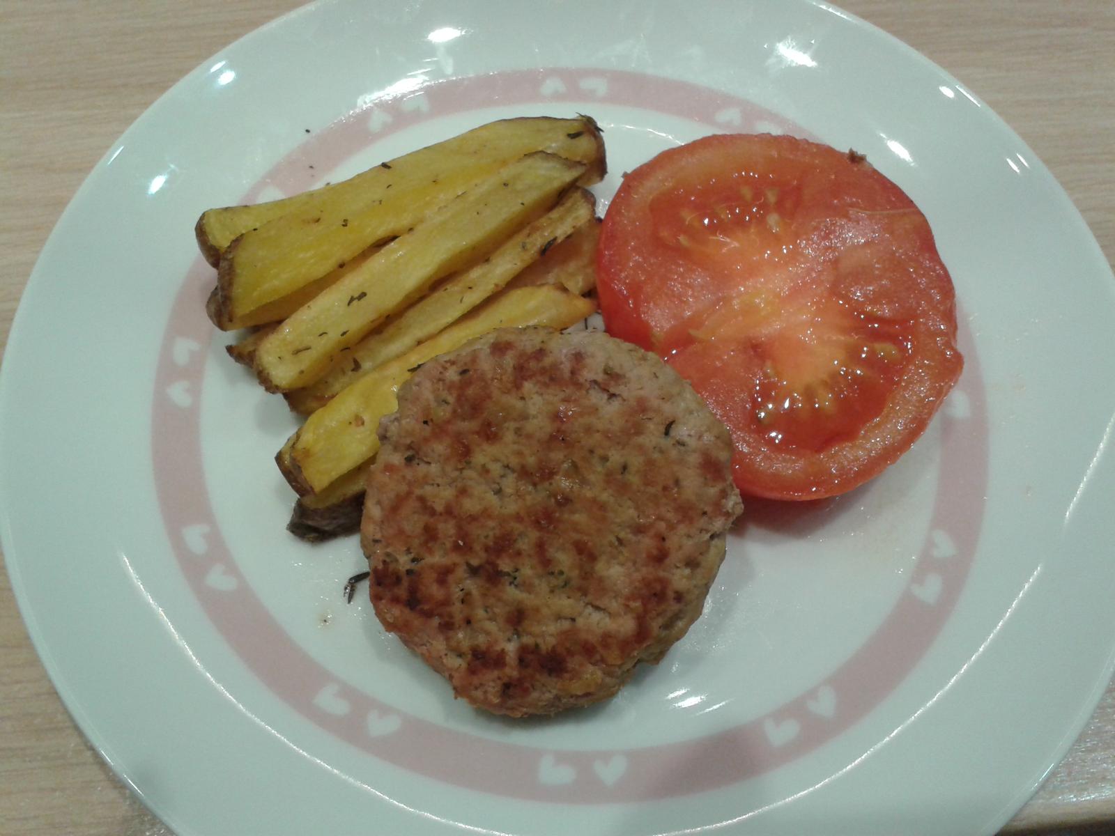recept: namleté telecí maso jsem ochutila provensálským korením, pridala cibulku a trochu kukuričné strouhánky, vytvarovala jsem karbanátek, který jsem opekla z obou stran na pánvi a potom dala péct na 20 minut do trouby, na posledních 5 minut jsem pridala rajče brambory jsem umyla a i se slupkou nakrájela na tenké hranolky, dala do pekáčku, posypala provensálským korením, trochou soli a lehce yakápla olivovým olejem, pekla jsem v troube do zhnednutí