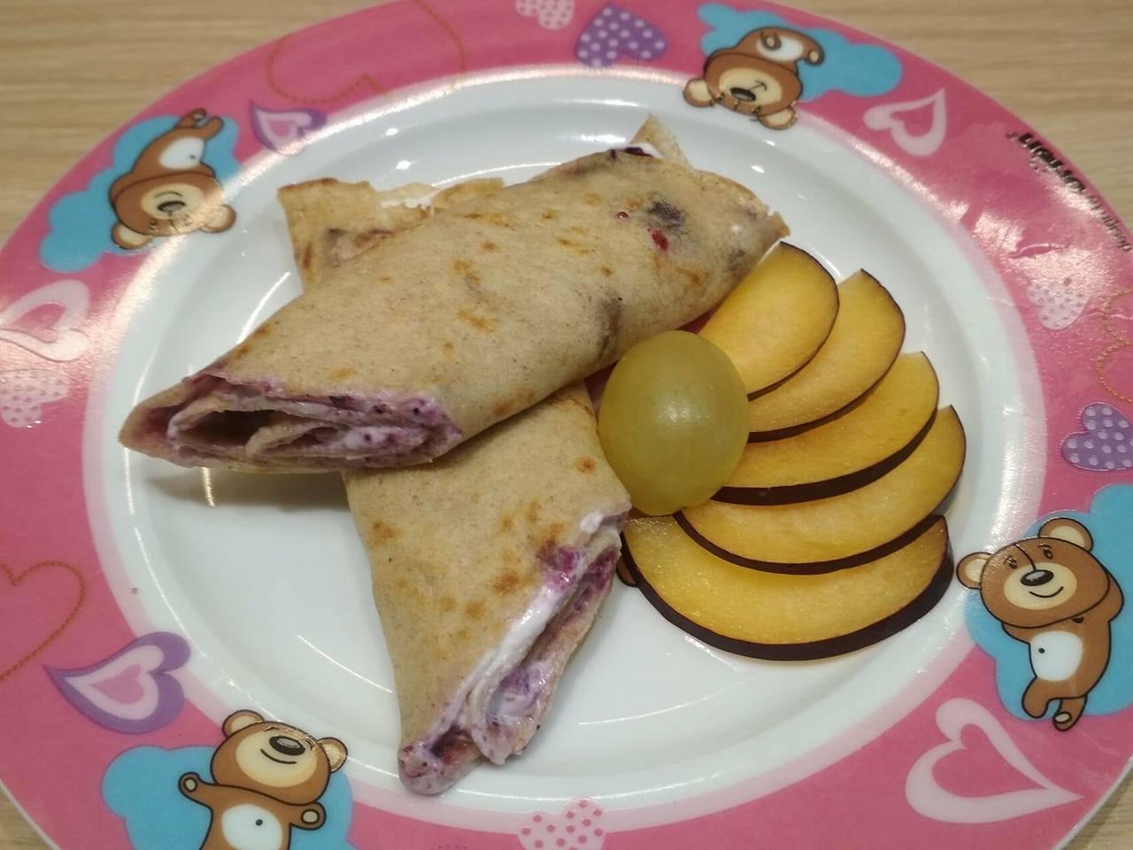 recept: pšeničná celozrnná mouka mandlový drink 5 mandlí vanilkový extrakt 1 vejce všechny suroviny jsem dala do mixéru a vymixovala hladké ridčí testo, na kokosovém oleji jsem upekla tenké palačinky, potrela tenkou vrstvou domácího boruvkového džemu a zakysanou smetanou