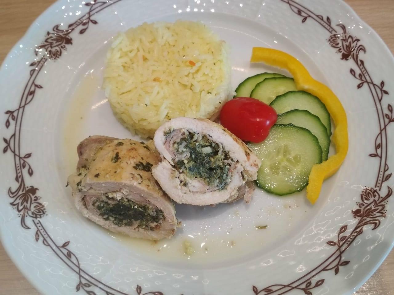 recept: na nápln jsem si osmažila cibulku a česnek, pridala porcovaný mražený špenát, osolila, pridala detskou vegetu a chvilku povarila, nakonec jsem primíchala lučinu a kousek tvrdého strouhaného sýra kurecí plátky jsem naklepala jemne posolila, posypala baby grilem, na každý jsem dala plátek libové šunky a kopeček špenátové náplne, vše jsem zarolovala a bez upevnení vložila do sklenené mísy, tak natesno, aby se závitky nerozbalily, podlila jsem vše trochu vodou a pekla v troube pri 200 stupních asi hodinu, jako prílohu jsem dala jasmínovou rýži a zeleninku