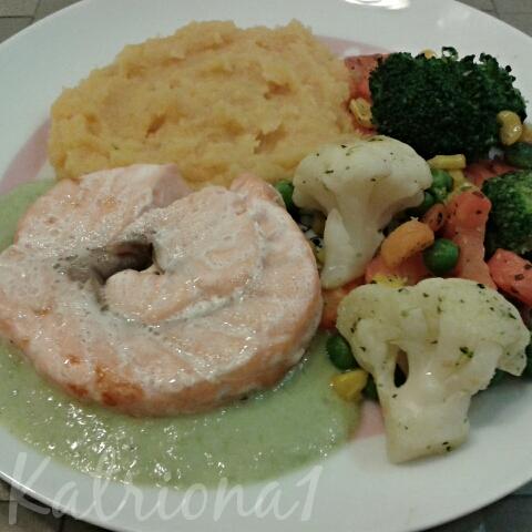 pečený losos s batátovým pyré, restovanou zeleninou a hráškovo-fenyklovou omáčkou