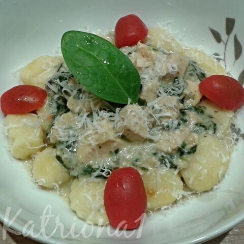 na oliv. oleji jsem krátce orestovala cibulku, pridala jsem nakrájené kurecí prso, krátce jsem orestovala, potom jsem pridala česnek, pokrájený listový špenát ( muže být i mražený porcovaný ) kousek porku sul a pepr, vše jsem podlila vodou a dusila do zmeknutí, zahustila jsem jedním malým bramborem, který jsem syrový rozmixovala s vodou, vše jsem ješte povarila asi 5 minut a nakonec jsem omáčku zjemnila trochou rýžové smetany ( muže být i normální )
