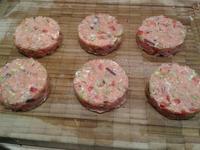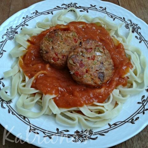 namlela jsem si maso, pridala jsem do nej zeleninu, vajíčka, olivy, rajčatový protlak, korení a česnek a z 2/3 jsem udelala sekanou, ze zbytku jsem udelala 6 malých karbanátku, ty jsem krátce z každé strany opekla na troše oliv. oleje a potom jsem je asi 30 minut dopekla v troube