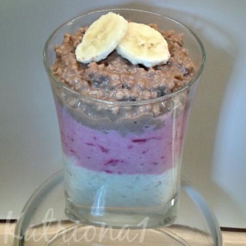 recept: 45g. pšena 6 lžiček jogurtu ( asi 3/4 kelímku ) 1/2 banánu 5 jahod lžička kakaa ( pro menší deti muže být karob ) javorový sirup ( muže být i jiný ) pšeno jsem 3x propláchla varící vodou a dala varit do 2 násobného množství vody na 20 minut a potom jsem ho rozdelila na tři části BíLÁ vrstva - smíchala jsem 2 lžičky jogurtu, rozmačkaný banán a 1/3 vareného pšena JAHODOVÁ VRSTVA - smíchala jsem 2 lžičky jogurtu, rozmixované jahody, trochu javorového sirupu a 1/3 vareného pšena KAKAOVÁ VRSTVA - smíchala jsem 2 lžičky jogurtu, kakao, trochu javorového sirupu a 1/3 vareného pšena barevné vrstvy jsem uložila na sebe, dezert se muže jíst teplý, i za studena