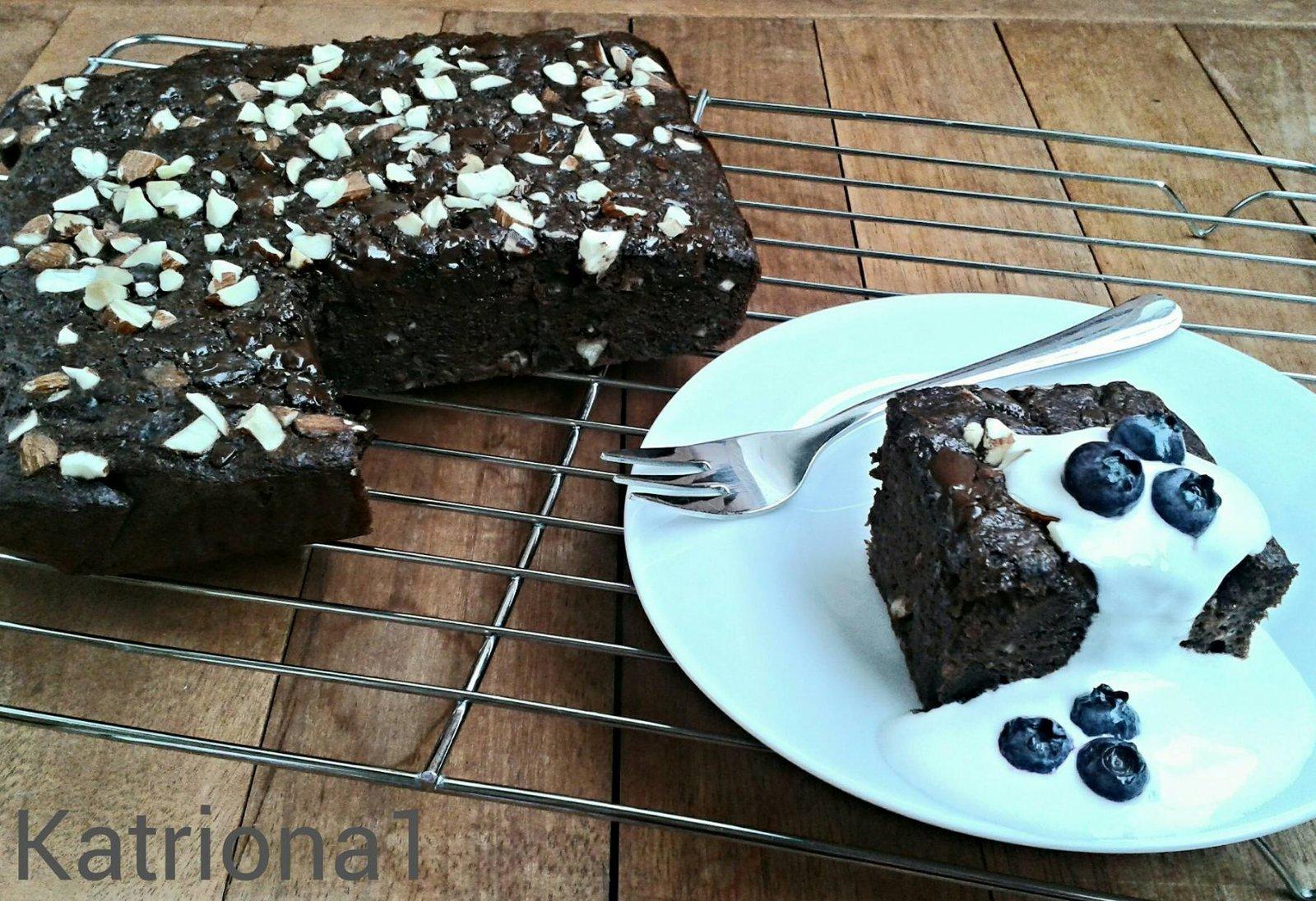 recept: 60g. celozrnné mouky 20g. kakaa 4 ks. banánu 3ks. vejce 50g. mandlí 50g. hořké čokolády 1/2 bezfosfátového prášku do pečiva vanilka, skořice v misce jsem smíchla mouku s kakaem a kypříkem, přidala jsem vajíčka, rozmačkané banány a korení, všechno jsem dohromady vymíchala na těsto a nalila do malého pekáčku, vyloženého pečicím papírem, vrch jsem posypala nasekanou čokoládou a ořechy, dala jsem péct do trouby na 180 stupnu, na asi 35 minut podávala jsem se zakysanou smetanou a boruvkami