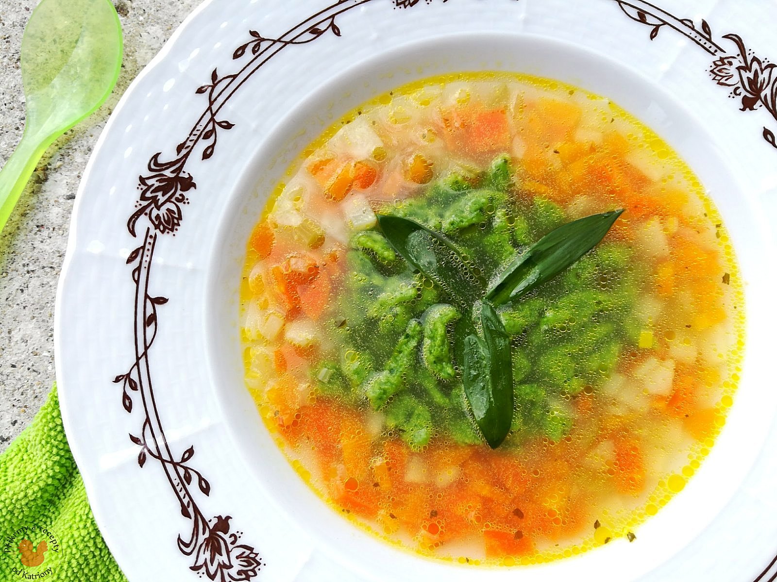 1r.+ ZELENINOVÁ POLÉVKA S HALUŠKAMI Z MEDVĚDÍHO ČESNEKU