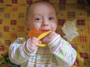Až sme sa v jeho 4 mesiacoch dopracovali na chirurgiu na Kramároch, kde mu spravili kolonoskopiu a zistili že má zapálené celé hrubé črevo. Po celom má krvavé ložiská. Diagnóza je proktokolitída, nezistená alergia na potraviny, je to autoimunitné ochorenie. Doporučenie lekárov: pre mna stále nemliečna diéta (aj keď som im tvrdila že nepomáha) a Samka naučiť na antialergénne umelé mlieko. Po návrate domov opať krv v plienke a hnačka. Samko fľašu s mlieko, ktoré je ešte aj horké, odmieta, plače a nechce ho piť. Takže som si ja nasadila úplnú diétu. Vylúčila som nielen mliečne výrobky ale aj lepok a vajcia a samozrejme tak ako aj doteraz všetky potraviny ktoré nadúvajú, orechy, čokoláda a citrusy. Moc veľký výber na jedlo nemám, ale čo iné mi zostáva. Prekvapivo už po 2 dňoch tejto diéty má Samko lepšiu náladu, prestal plakať od bolesti, stolica sa zmenila zo zelenej na krásne žltú, aj keď je ešte riedka. Vyzerá to na alergiu na lepok.